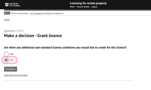 The officer will be presented with a question to add additional non-standard licence conditions. Selecting 'No' allows the user to progress with completing the decision without adding any new conditions.