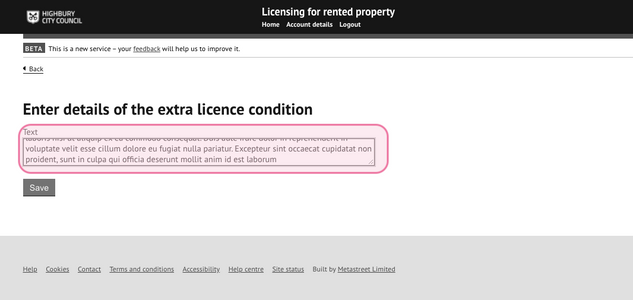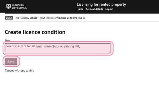 3. Enter the text for the new licence condition and press 'save':