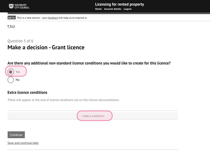 Selecting yes will display options to create a new bespoke licence condition:
