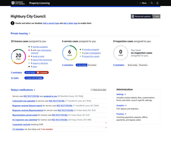 Highbury City Council landing page featuring personalized task donuts for assigned license and service cases, along with a live notifications feed.