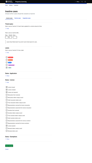 This page is used to set your own rules for what should be treated as an inactive case. Each council can decide when a case becomes inactive, based on time, labels, or case status.