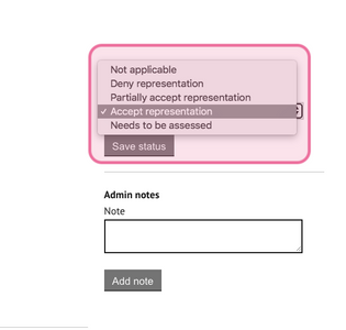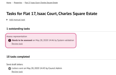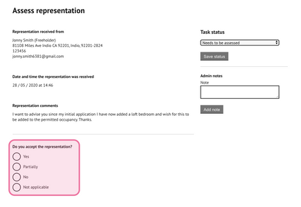 A task will be generated to view the representation received and make an assessment. A copy of the actual representation form will also be saved to the document store.