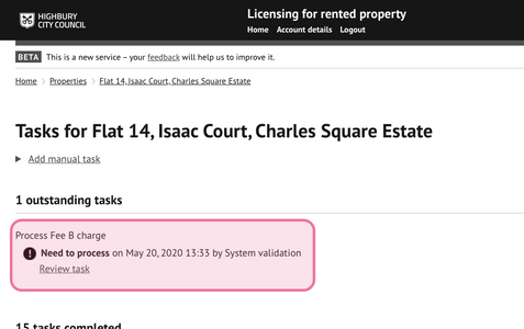This task may appear later in the process depending on when the council has decided to recovery this fee.