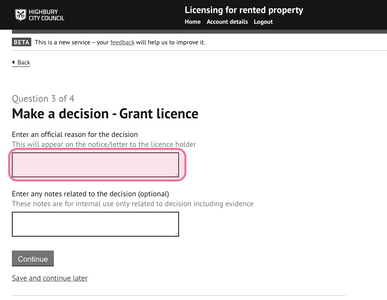 A decision reason must be entered for licences that are not full term (i.e. not 5 years). The statement of reasons will be placed on the notice granting the licence.