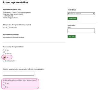 No (Rejecting representation)- If you do not accept the comments. Enter a reason and determine if an email to the consultee is required containing the reasons for the rejection. An email will automatically be sent once all fields have been completed and the task has been updated. A copy of the email will be saved to the document store.