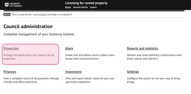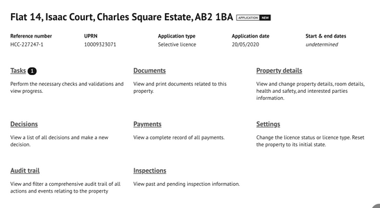 Property details – Displays information contained within the application form including property details, interested parties, health and safety, room details and licence conditions. Editing of this data is available for most sections.