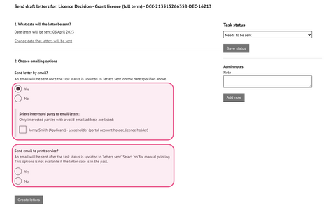 Note: no emails will be sent until the task status has been updated to 'letters sent'Press 'Create letters' after the emailing and print options have been completed to generate the letters to all interested parties.