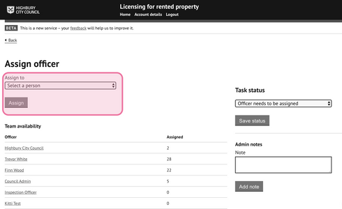 - Select the council officer to be assigned to this application for processing from the dropdown list.