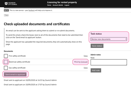 If you require further copies or missing documents to be (re)submitted you can select the documents you want submitted by checking the tick-box against the document name and pressing the 'send email to applicant' button.