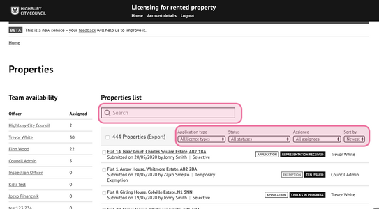 - Using the filters to refine the list of applications on display by application type, assigned user and/or record status