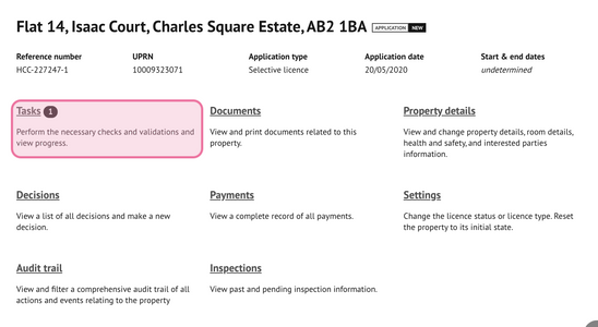 Tasks – Prompts steps required to progress the application or licence
