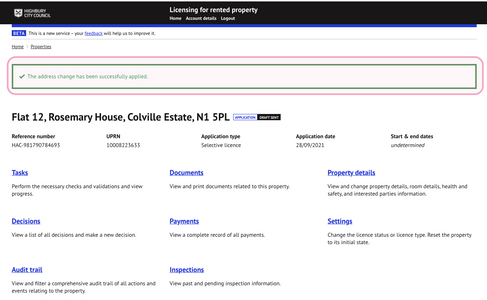 It will not be possible to change the address to one where another active application or licence already exists for that property to prevent duplication.