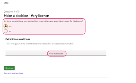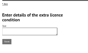 Select from a list of additional pre-set licence conditions to add to the existing regular licence conditions. Your system administrator is responsible for maintaining this list and should be contacted if adjustments are required.