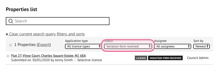 All submitted variation forms will appear in the property list and can be filtered by status type:
