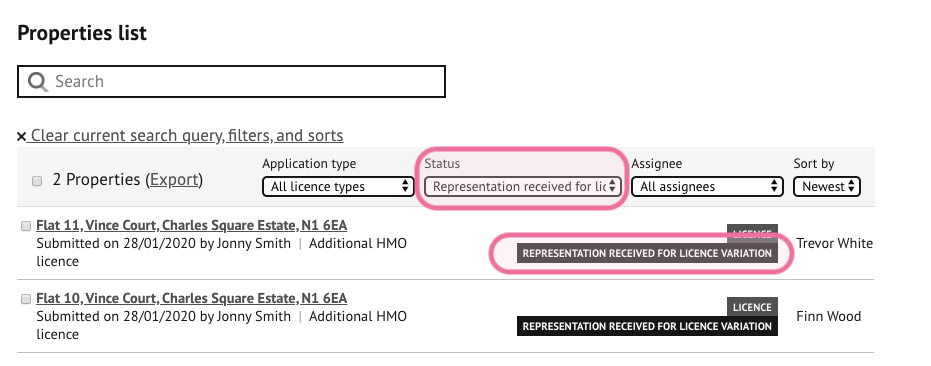 If representations are received during the consultation phase of the variation notice, these will appear on the main property list page as `Representation received for licence variation`.