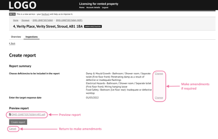 4.6 Once satisfied that the report is ready to send, select `Create report` to generate the report ready for sending to the landlord
