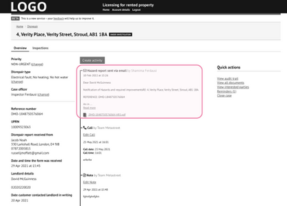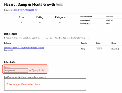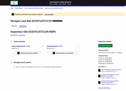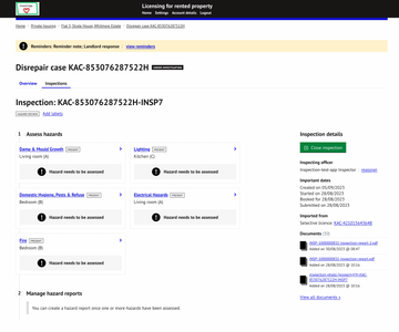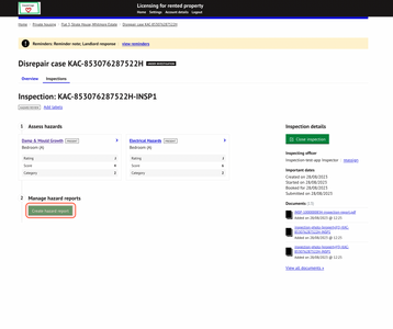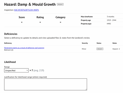 - Hazard review – Inspection submitted, record awaiting HHSRS assessment