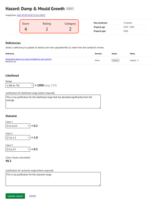 - Hazard scoring – The hazard score is populated once the HHSRS assessment is completed for the hazard. Click on ‘change’ from this screen to update the likelihood and outcomes for the hazard.