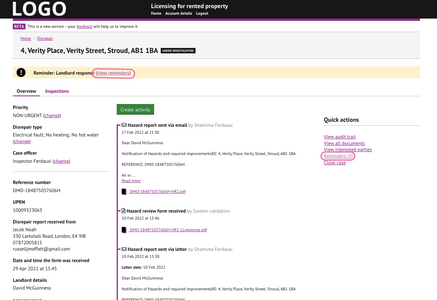 - A yellow banner is displayed on the main disrepair overview page and displays any reminders related an overview response from the landlord