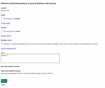 - Notes from landlord review(s) - Any notes provided by the landlord via the online response form in response to the hazards report issued