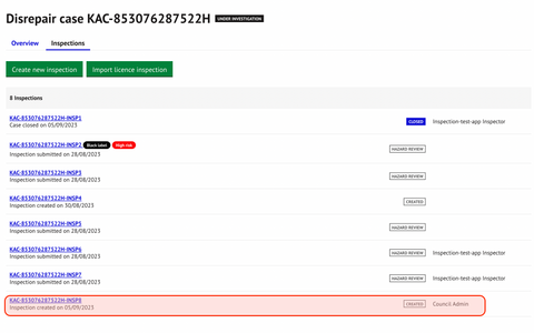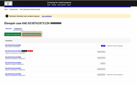 Click on `Import licence inspection` on the inspection tab of a disrepair case record: