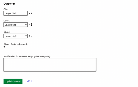Once all ranges have been selected and populated, the score, rating and category of the hazard will be calculated and displayed to the top of the page: