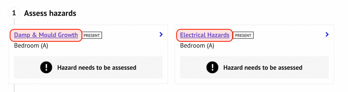 1 - Assess hazards - lists all hazards identified during the inspection and the status of the assessment. The HHSRS rating is displayed once the HHSRS assessment is completed. The presence or removal of any hazard is also identified.