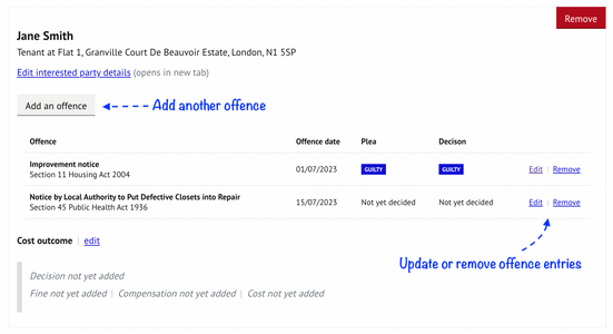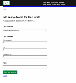 - Select the cost decision from the available options and then enter any costs awarded, fines imposed or compensation value.