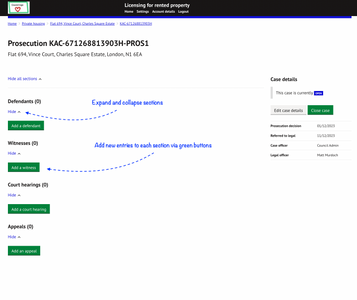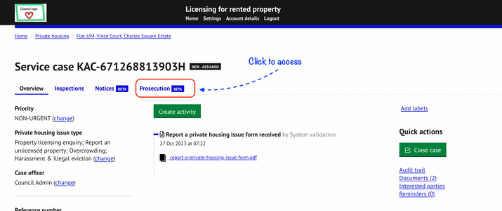 Prosecutions cases can be created on any service case record and can be accessed via the tabs to the top of the service case overview page: