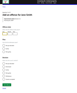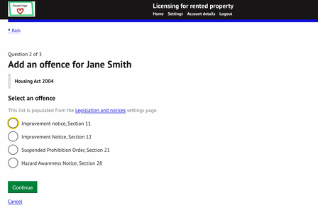 Note: This list can be managed by the admin user for the authority in the Legislation and notices settings page.- Enter the offence date