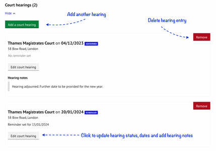 The hearing entry will be added to the list of hearings and further hearings can be added as required:
