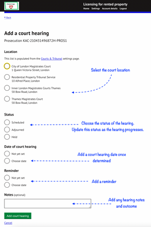 Click the ‘Add a court hearing’ button under the 'Court hearing section' to add a hearing and related information.