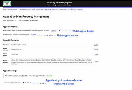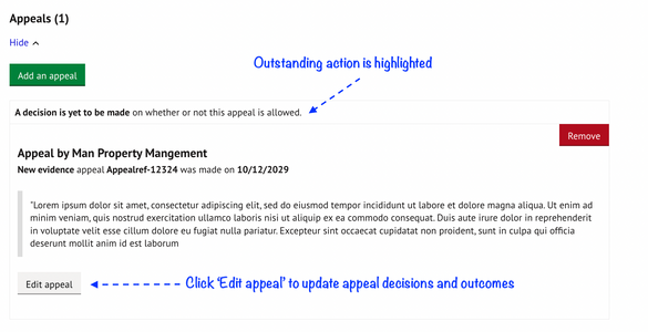 The appeal will then be recorded. Click on 'Edit appeal' to add further appeal information or outcomes once available: