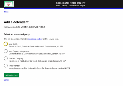 Once selected, the interested party will be added as a defendant on the prosecution case. Repeat this step to create multiple defendants.
