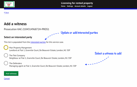 Click on ‘Add a witness’ under the 'Witness' section and then select from the list of available interested parties for that record: