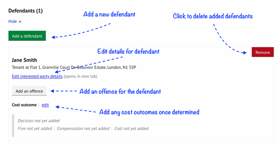 - Defendant - Enter information on defendants and offences committed including any court decision and costs
