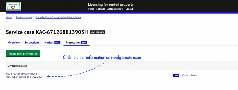 A new prosecution case record will be created. Click on the reference to start adding information to this prosecution case: