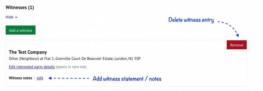 Select ‘edit’ against the witness notes to add a witness statement or note: