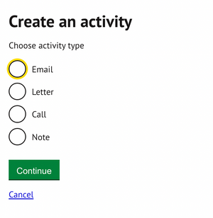 Click on create activity on top of the activity timeline to create a note, record a phone call or send email or letter correspondence: