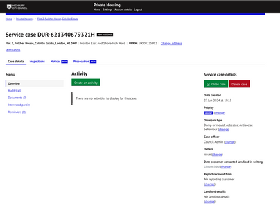 The following URL will take users to the front-end form to report a private housing issue. The customer should complete all pages and submit the form on completion for a service case record to be generated.