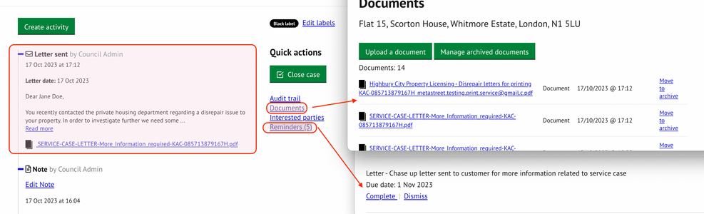 - A copy of the letter will be saved and also accessible from the action enter or via ‘Documents’ under ‘quick actions’.