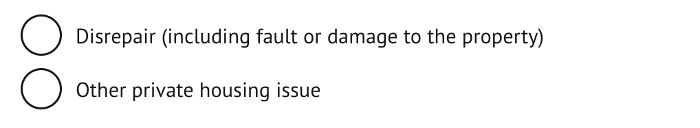 Elements of the form can be configured by a system admin user, including the introductory text and the categories of disrepair and private housing issues. See our guide on `Service case form configuration` in the help centre for instructions.