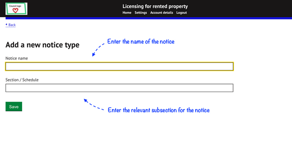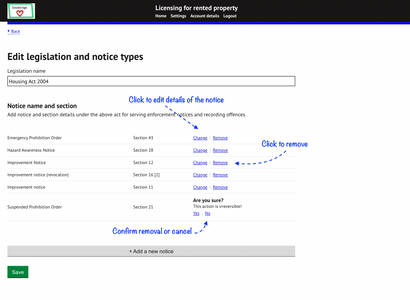 Click ‘save’ to return to the previous screen and repeat step 2.3 to add more notices under the same legislation: