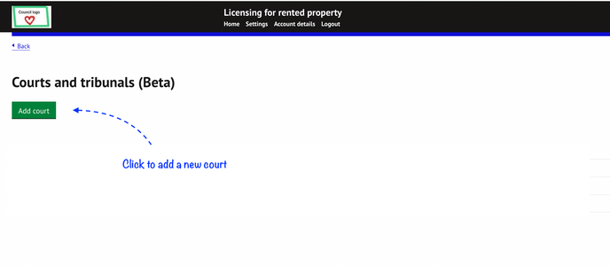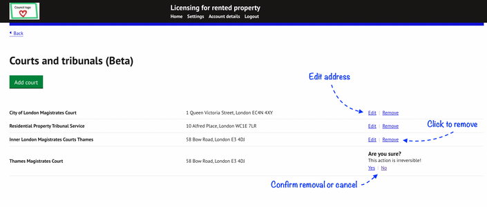 - Court/tribunal entries can be deleted by selecting ‘Remove’. A prompt will appear to confirm the removal of the court before it is deleted.