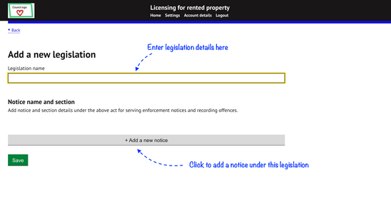 2.2 Enter the name of the legislation and then click on ’Add a new notice’ to create notices under that Act