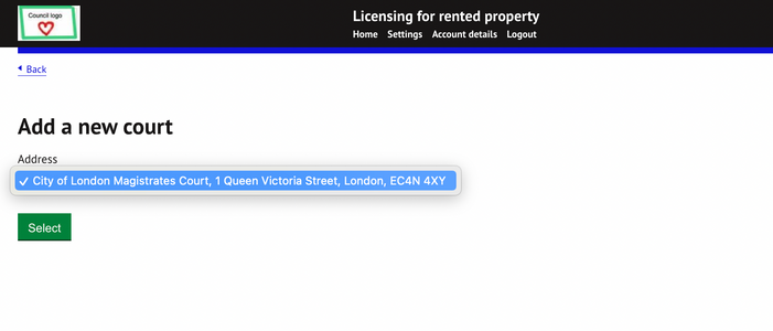 1.3 Choose court/tribunal address from list and press ‘Select'