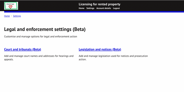 Legislation and related Notice (or Order) information is used for creating notice templates and recording offences for prosecution cases.