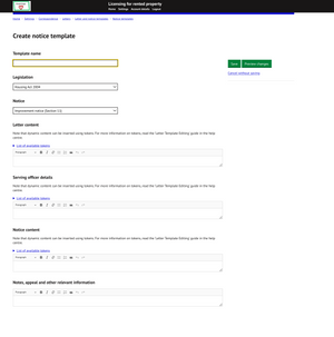 These template should contain standardised text that can be further edited for a particular case or investigation by officers when generating notices for serving. Tokens can also be applied to auto-populate case related data into specific locations within the letter or notice to reduce the number of manual updates required to a notice by a serving officer.