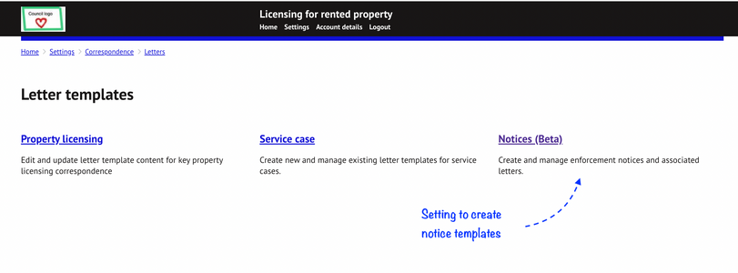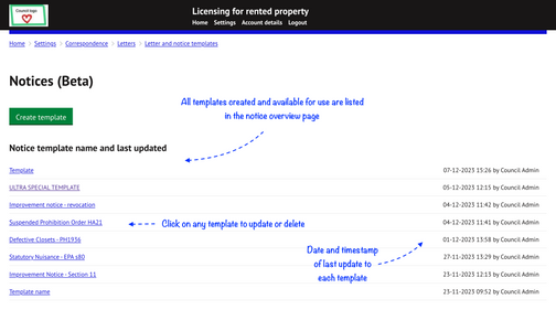 A council admin user can create notice templates and accompanying letters that can be used within the Service Case module to generate and issue enforcement notices (and orders).